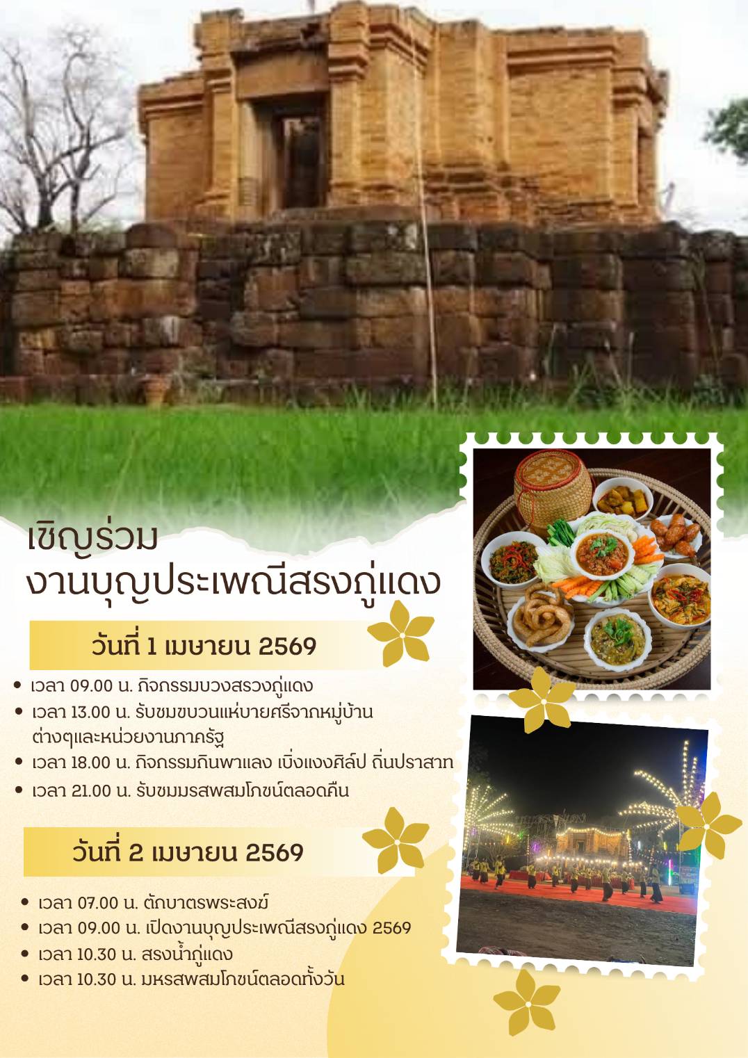 ขอเชิญร่วมงานบุญประเพณีสรงกู่แดง ระหว่างวันที่ 1 - 2 เมษายน 2569 ณ วัดกู่แดง บ้านกุดยาง หมู่ 3 ตำบลตลาดแร้ง อำเภอบ้านเขว้า จังหวัดชัยภูมิ |